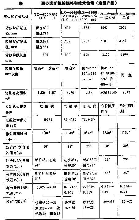 有許多改進是用戶很據需要自行采取的,尚未列入統一標準,已經定型的離心選礦機系列規格和性能列于表中。