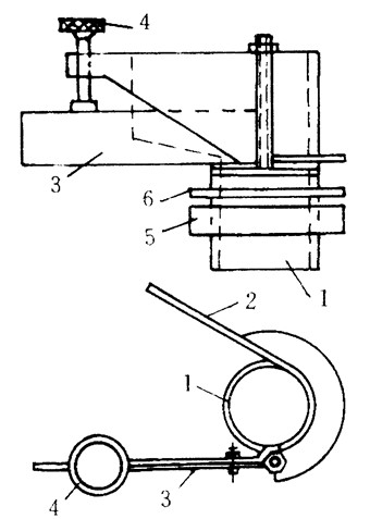 1—排料管;2—固定刮板;3—可動刮板;4—壓緊螺釘;5—螺母;6—墊圈