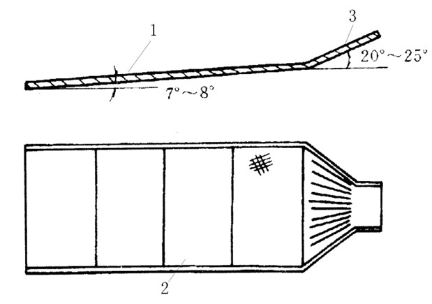 鋪面(布)溜槽的結(jié)構(gòu)如圖所示,可用木板或鐵板制作。槽寬1~1.5m、長2~3m。頭部有分配礦漿用的勻分板,槽底面不設(shè)擋板,而采用表面粗糙的棉絨布、毛毯、棉毯、尼龍?zhí)旱茸鲣伱妗9ぷ鲿r(shí)槽面坡度為7°~8°,勻分板角度為20°~25°。選金時(shí)的入選粒度小于1mm。可用于處理餛汞或浮選的尾礦。給礦濃度為8%~15%。