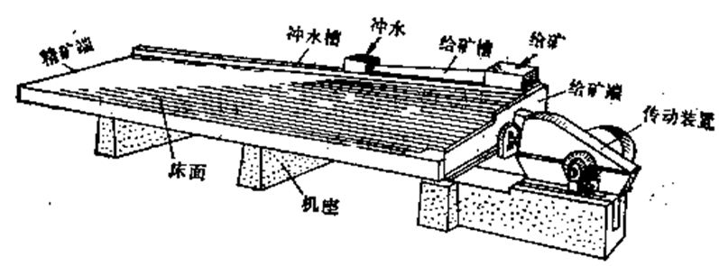 (1)床面,床面可用木材、玻璃鋼、金屬(如鋁、鑄鐵)等材料制成。其形狀常見的有矩形、梯形和菱形。沿縱向在床面上釘有許多平行的床條(又稱來復條)或刻有溝槽,床條自傳動端向對邊降低,并在一條斜線上尖滅。床面由機架支承或由框架吊起。搖床的床面是傾斜的,在橫向呈1.5~5度由給礦端向對邊傾斜,這樣由給礦槽及沖洗槽給入的水流就在床面上形成一個薄層斜面水流。床面右上方有給礦槽,長度大約為床面總長度的1/3~1/4;在給礦槽一側開有許多小孔,使礦漿均勻地分布在床面上。與給礦槽相連的是沖水槽,占床面總長度的2/3~3/4,給水槽側也開許多小孔,使沖水也能沿床面縱向均勻給入。在槽內還裝有許多活瓣,用以調節水量沿床面長度的分配。